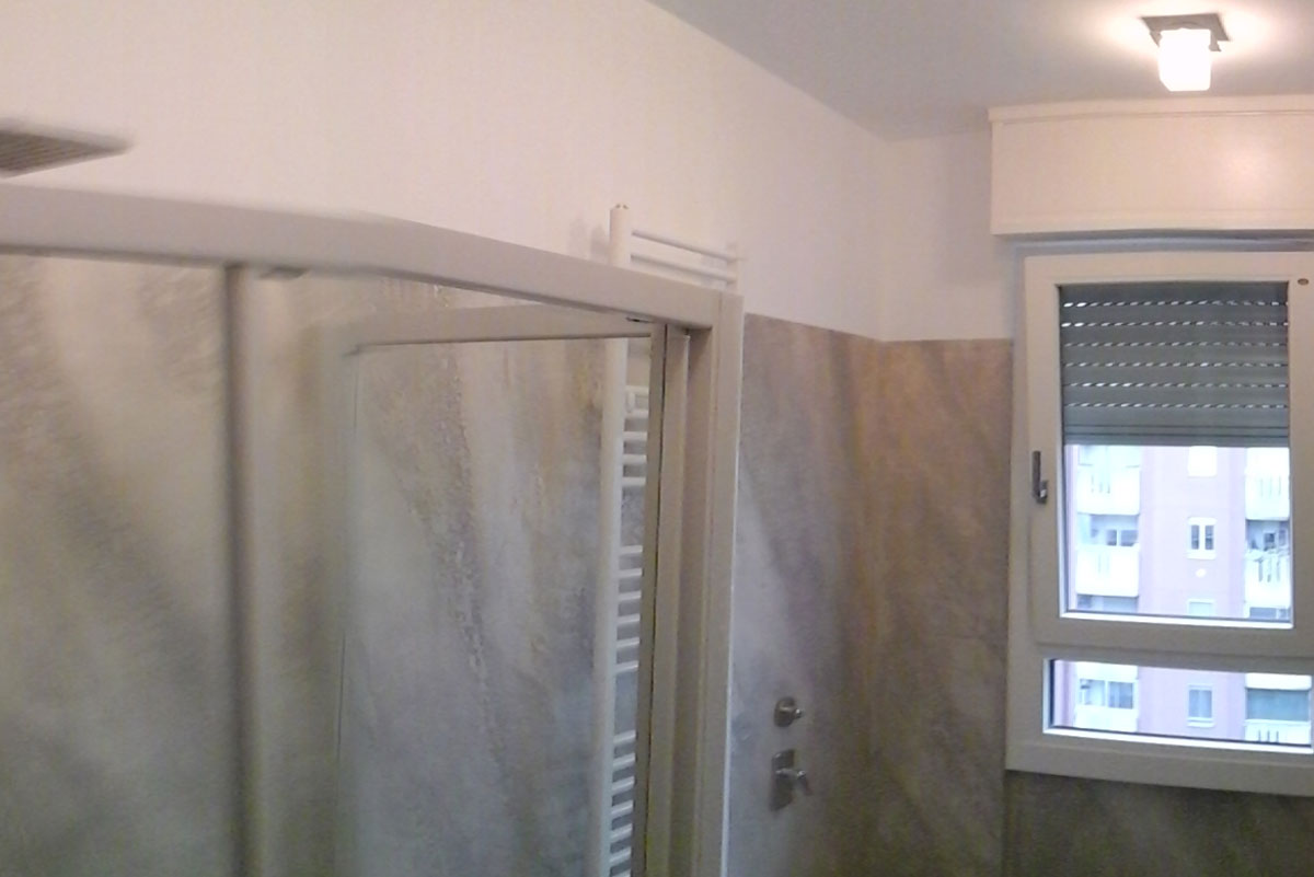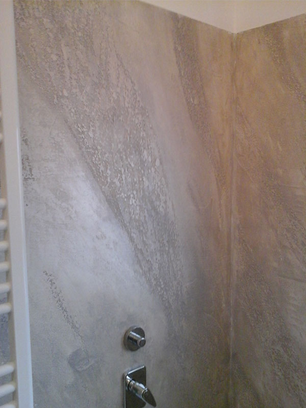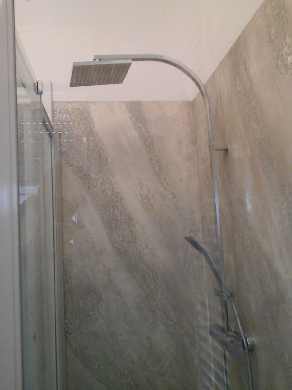 Al cliente abbiamo subito proposto al posto delle piastrelle, un rivestimento differente già più volte utilizzato e collaudato con risultati eccezionali, la finitura Alter Ego che è un rivestimento per interni a base di grassello di calce stagionato, additivato con carbonati selezionati e farine di marmo di Carrara in varie granulometrie