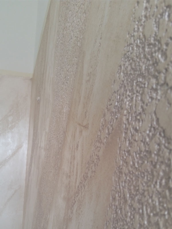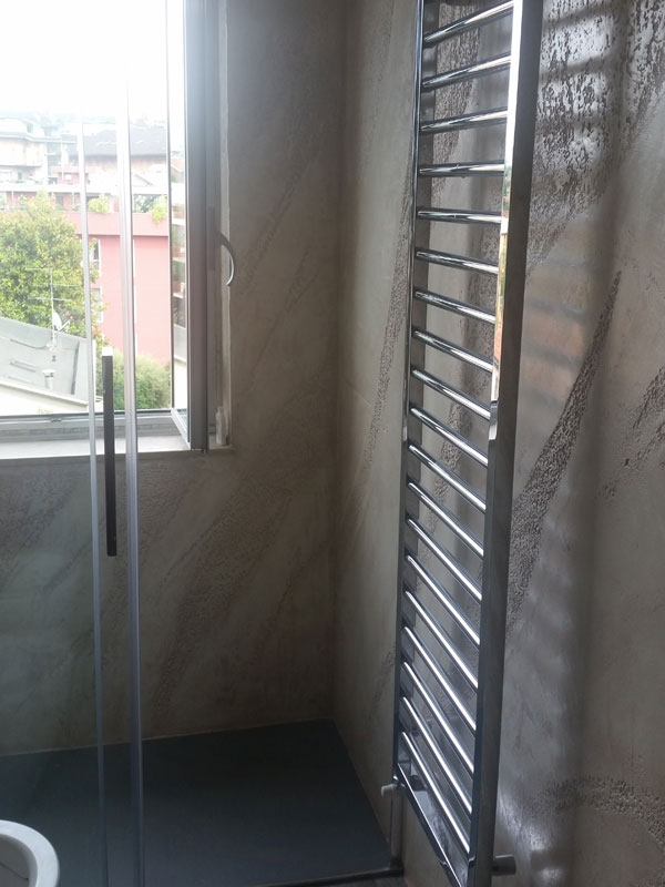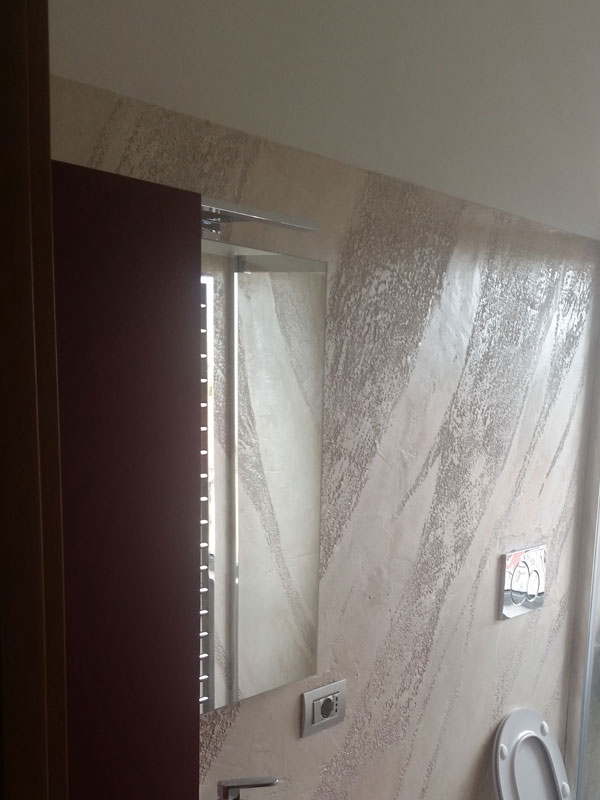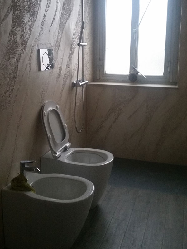 Abbiamo proposto 3 progetti differenti per il bagno.  Una volta definito il progetto si è passati alla scelta dei materiali: piastrelle per i pavimenti in gres porcellanato finto parquet, mentre per il piatto doccia la scelta è caduta su un piatto in  marmoresina finta pietra, con posatura a filo pavimento e che riprenderà anche il rivestimento fatto con Alter Ego: lavorazione “pietra spaccata”.